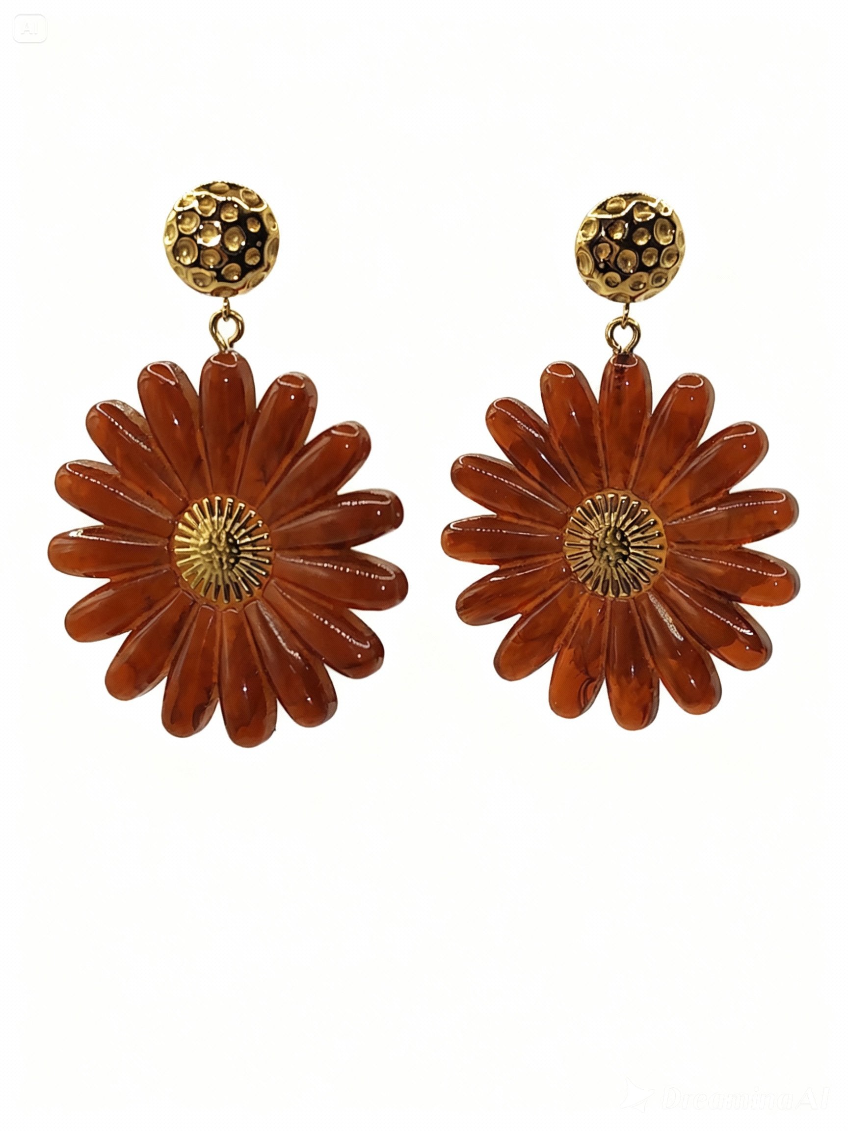 Elégantes et poétiques, les boucles d'oreilles Artémis sont une ode à la nature et au style bohème chic. Composées d'une large fleur en résine ambrée , délicatement suspendue à un fermoir en acier inoxydable doré, elles apportent une touche de lumière et de modernité à vos tenues.