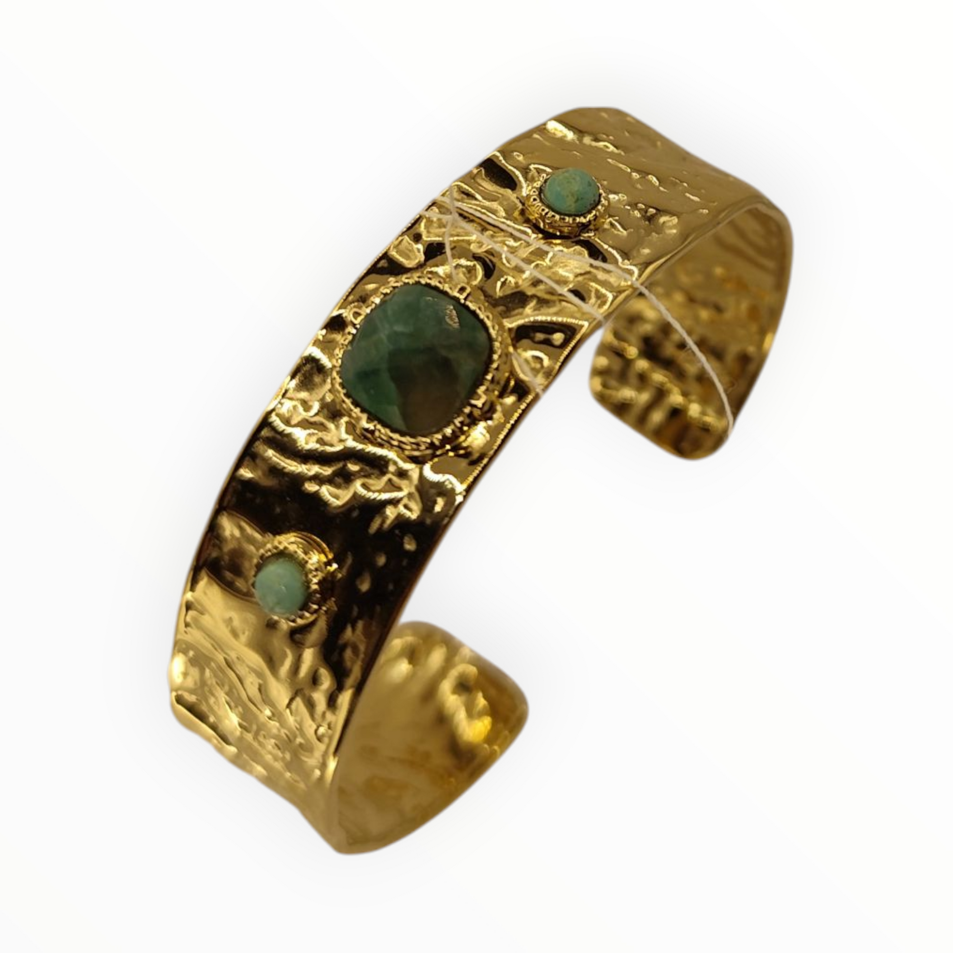 Sublimez votre poignet avec cette élégante manchette dorée ornée de sa pierre verte effet turquoise. Son design martelé et ses finitions raffinées apportent une touche à la fois bohème et chic à toutes vos tenues.