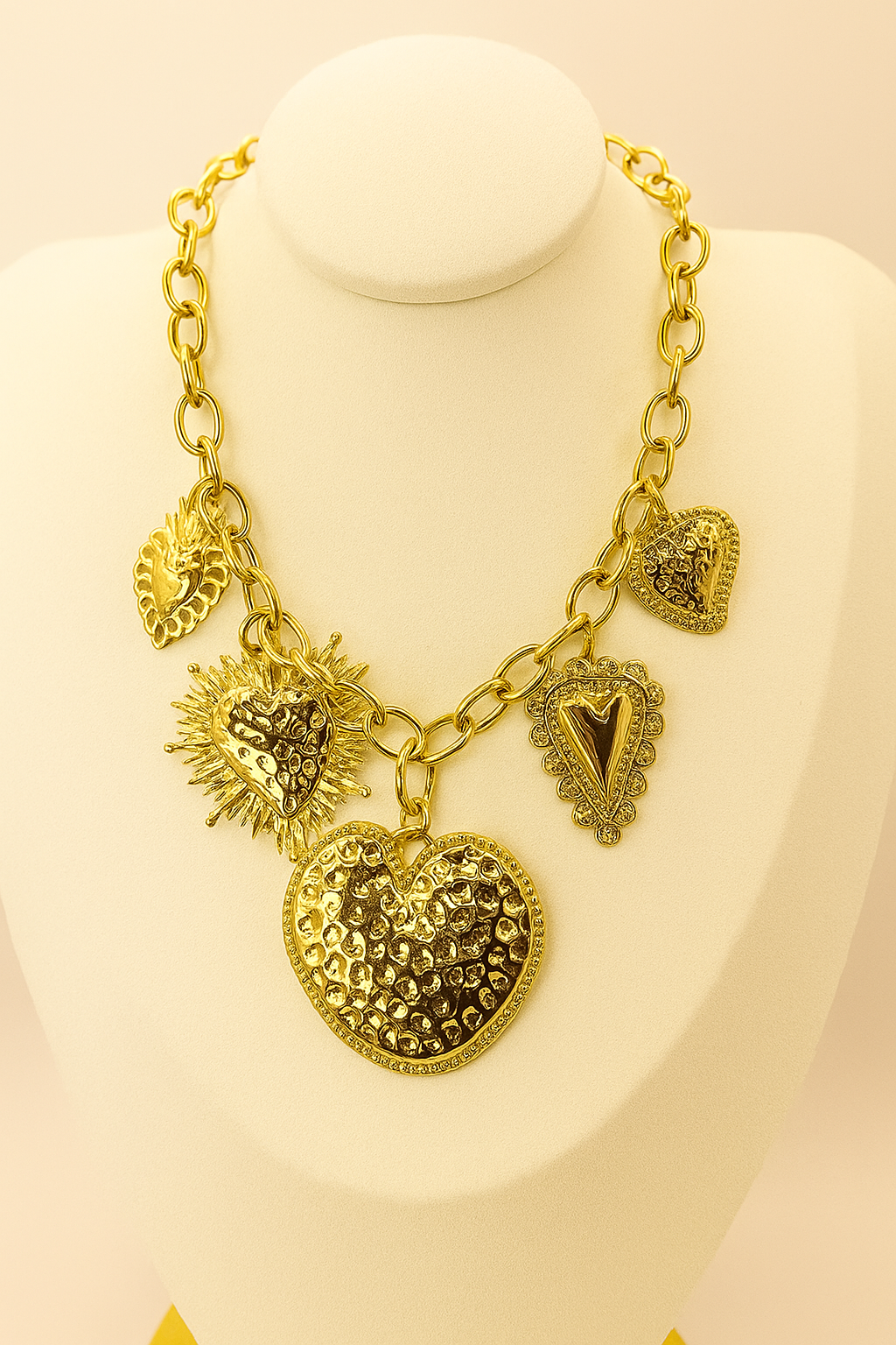 Ce bijou ce distingue par ces pendentifs en forme de cœur, chacun finalement travaillé avec des détails martelés et ajouré, pour un rendu lumineux et raffiné. Sa chaine à gros maillons apporte une touche moderne et tendance, tout en restant confortable à porter.